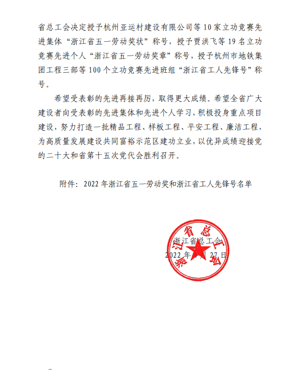 4月27日,我司新建浙江麗水機場(第一批)02 標段項目部榮獲“浙江省工人先鋒號”稱號。