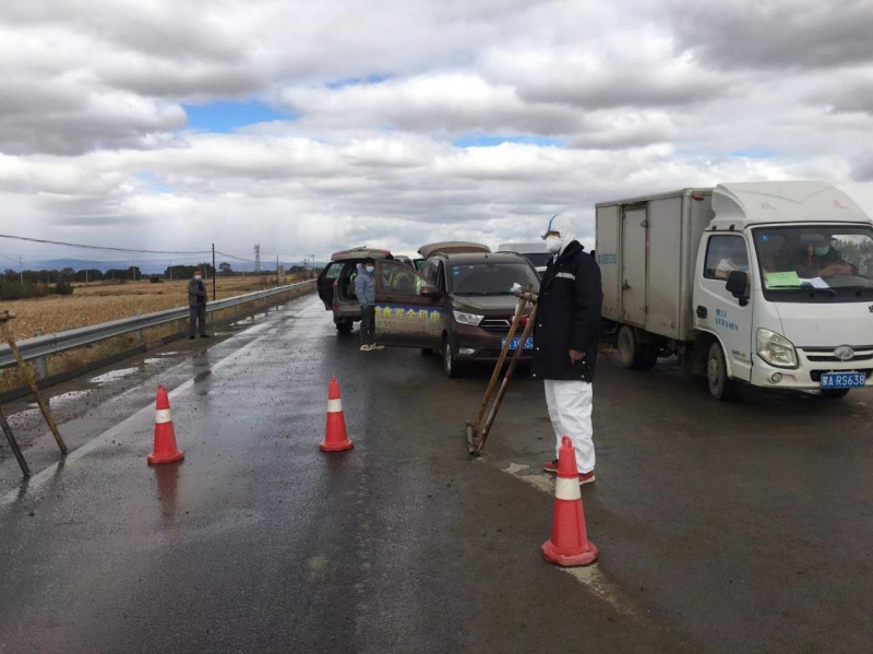 項目部黨支部書記杜騫,第一時間安排人員對北門卡口進行布置,安排采購疫情物資(醫用口罩、防護服、測溫槍、消毒液等),與10月1日10點左右在新機場北門疫情防控卡點布設完畢,配備了12名項目部管理人員(8小時三班倒)在卡口進行疫情防控。新機場北門疫情防控卡點人員對過往車輛、人員進行登記,掃碼、查看行程卡、核酸報告、登記來源地、去往地點。對無48小時核酸報告的人員進行勸返。